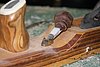 Cet archet, en cours de réalisation, est fait de bronze, d'ivoire, d'ébène, d'amaranthe et de peau de serpent