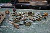 Vous pouvez voir ici différents outils de travail de l'artiste : alasoir, gouje, wastrigue, poite à âme, petit rabot